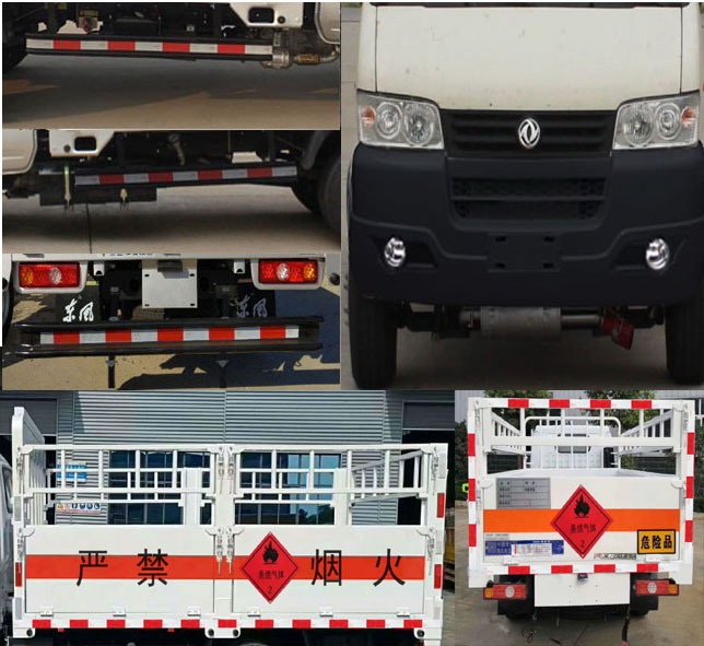 東風輕卡國六藍牌氣瓶運輸車是危險品廂式運輸車的一種。底盤配置:廂體尺寸:2700,3300x1750x360,額載質量:1820KG,軸距:2700,3300mm,發動機:柳州五菱LJ4A15Q6 (113馬力)汽油機,185R15LT 8PR鋼絲胎。其余按國家危化品底盤要求須具備前盤制動、ABS、限速裝置、排氣制動、排氣管前置,行駛記錄儀。