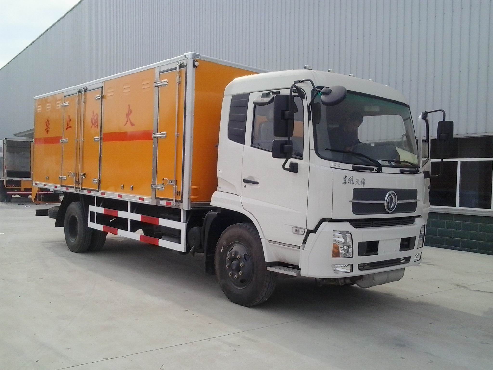 東風天錦9.98噸防爆車|民爆車.廂體頂部密封,不可開啟。有燃油公告,環保公告, 廂體外飾冷軋鋼板,內飾防靜電鋁板,底板鋪防靜電膠板,側壁設防雨通風窗口,帶捆綁固定拉環,煙霧感應器,防盜報警開關,靜電帶,滅火器2只,車廂黃色或白灰,有危險標志,貼有反光標識,廂體右側開側門,可選裝無側門廂體、帶隔倉箱體。駕駛室選裝白色,箱長6.1米。其他按國家爆破器材運輸車標準執行(底盤前盤(碟)后轂、電子限速器、行駛記錄儀、ABS)。