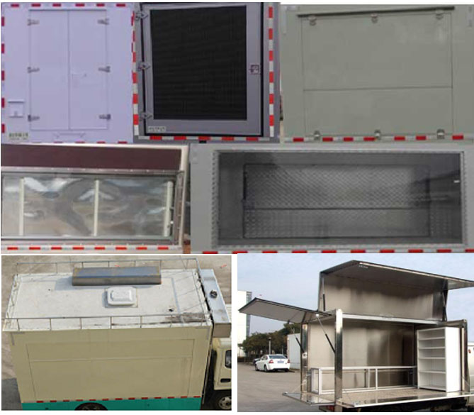 車輛顏色可選,文字噴涂位置可變化,車廂頂部選裝天窗、排煙罩,排氣口,護欄,水箱,護欄;整車外觀噴涂或粘貼宣傳標識;廂內(nèi)內(nèi)部設(shè)備可根據(jù)用戶要求定制如發(fā)電機,冰柜,冷飲機,售貨臺,炊具等;左側(cè)右側(cè)后側(cè)選裝不同結(jié)構(gòu)形式的側(cè)翻門、吧臺、舞臺、遮陽板、裝玻璃窗、亦可選裝LED屏舉升或者不舉升;前部選裝水箱;后部選裝LED屏,或者選裝百葉窗,爬梯,或者上翻或者側(cè)翻門;隨底盤選裝駕駛室。該車選用軸距:4100,3800。ABS型號:ABS/ASR-24V-4S/4M,廠家:襄陽東風(fēng)隆誠機械有限責(zé)任公司。 |