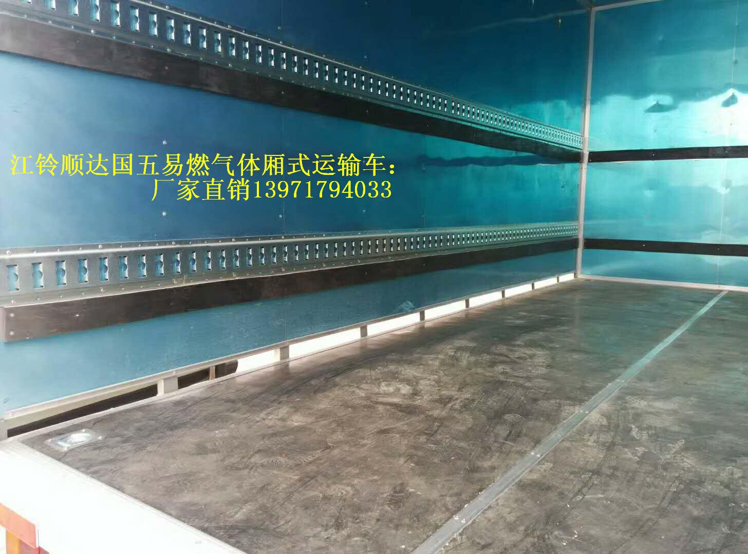 江鈴順達易燃氣體廂式運輸車運輸具有獨立容器(瓶)包裝的易燃氣體:液化石油氣,原油氣,壓縮天然氣,乙炔,甲烷,乙烷,丙烷,丁烷,丙烯,丁烯,二甲醚,打火機或打火機加油器(裝有易燃氣體),壓縮氫,類項號:2.1;運輸具有獨立容器(瓶)包裝的非易燃無毒氣體:液化氣體(非易燃,充有氮,二氧化碳或空氣),壓縮氧(氮,空氣,氦,氬,氖),二氧化碳,類項號2.2;該車為危險品貨物運輸車;廂體選裝瓦楞板結構,廂體側面選裝開門型式及位置或不帶側開門,選裝百葉窗,廂體顏色可變化,選裝液壓升降尾板(收起狀態水平長度為290mm);僅采用前輪盤式制動器,前置排氣管,子午線輪胎,限速裝置的底盤,限速80km/h。廣泛應用于乙醚、煤氣、石油液化企業,是易燃氣體氣瓶及非易燃氣體氣瓶的專用運輸車輛。