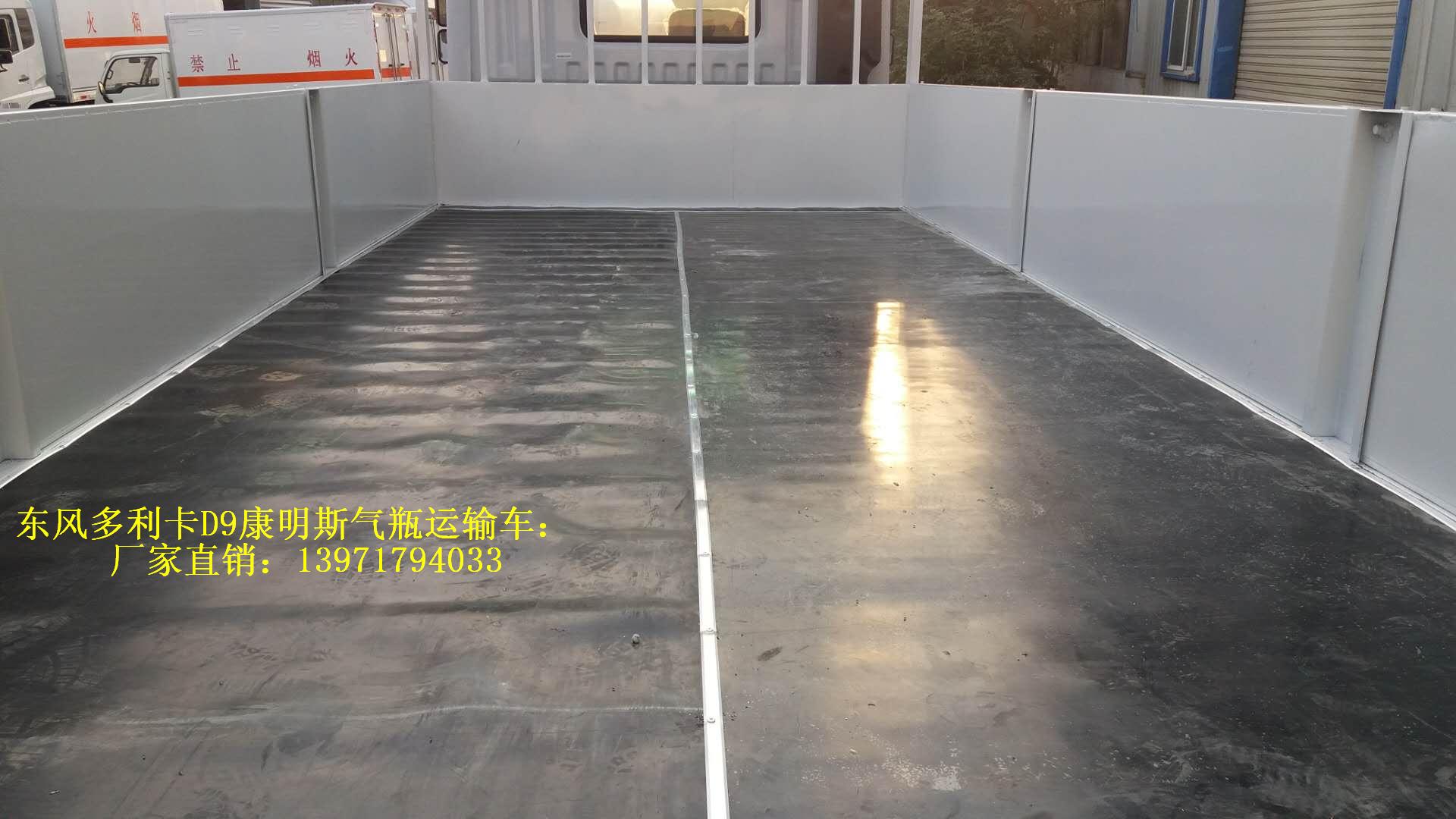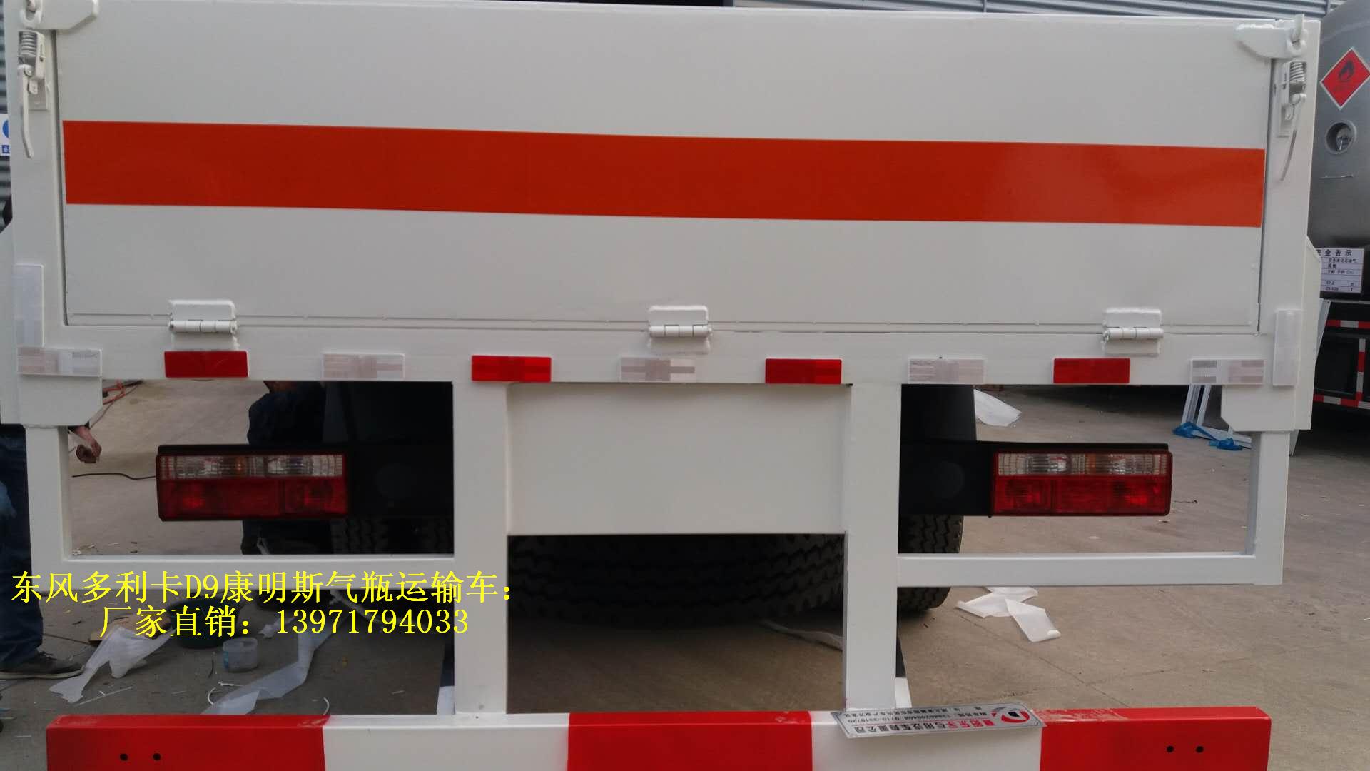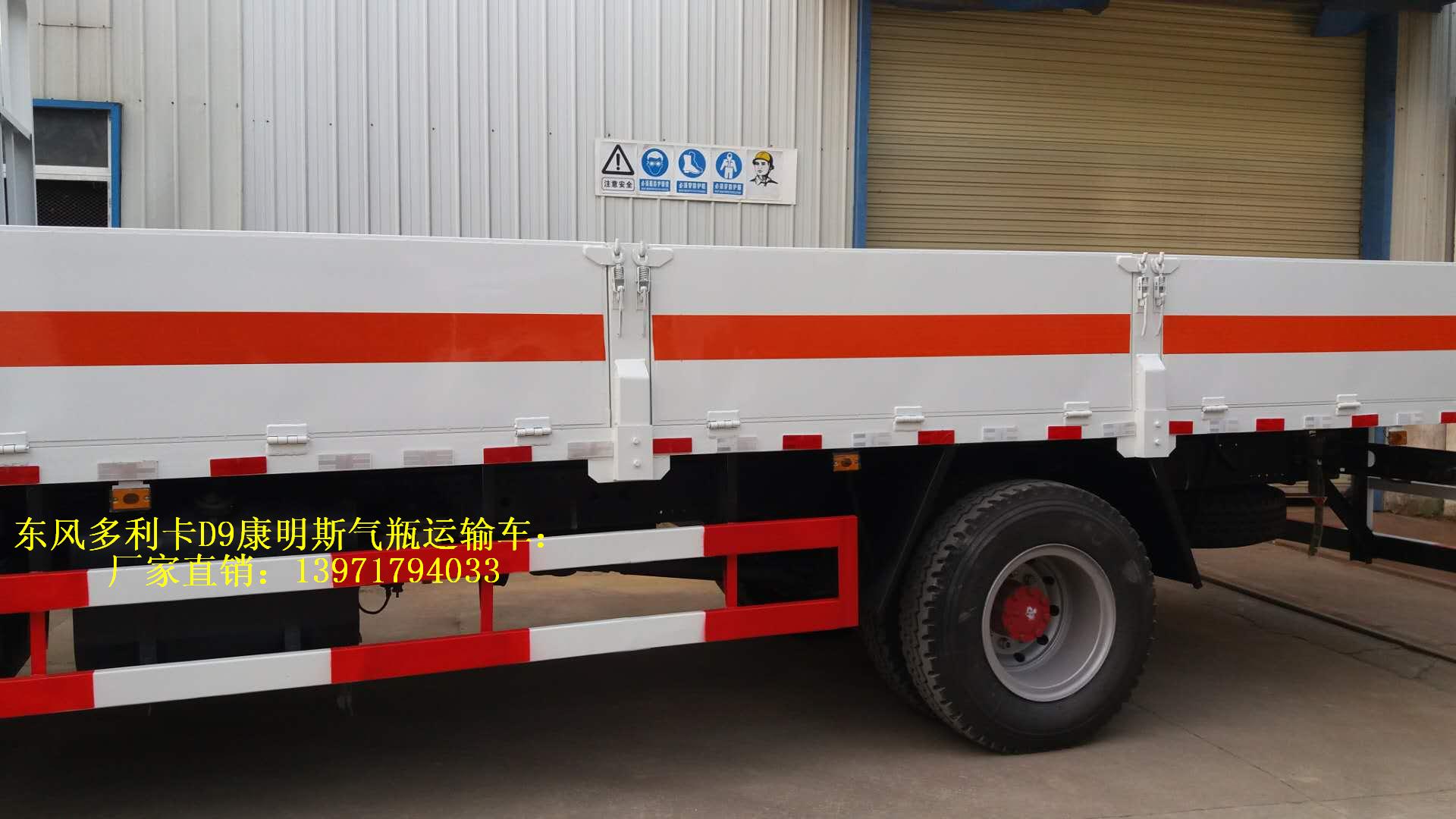 東風多利卡D9康明斯氣瓶運輸車為廂體選裝無柵欄.運輸具有獨立罐(瓶)容器包裝的易燃氣體:液化石油氣,壓縮天然氣,乙炔,乙烷,丁烷,丁烯,丙烯.甲烷.二甲醚,壓縮氫.類項號2.1,運輸具有獨立容器包裝的非易燃無毒氣體:二氧化碳,壓縮氧. 壓縮空氣(氮,氦,氬,氖),類項號2.2,該車運輸的氣瓶盛裝介質2.1項易燃氣體時,車輛左、右側及后部粘貼“易燃氣體”標示牌,該車運輸的氣瓶中盛裝介質2.2項非易燃無毒氣體時,車輛左、右側及后部粘貼“不燃氣體”標示牌.廂體顏色可變化.側面及后下部防護裝置材料為Q235,與車架采用焊接連接.后下部防護裝置斷面尺寸(mm):120×50,離地高度:490mm。選裝液壓升降尾板,選裝液壓尾板時收起狀態的水平長度為300mm,僅采用排氣管前置、子午胎,限速裝置,輔助制動裝置和前盤制動器的底盤;限速80km/h.。