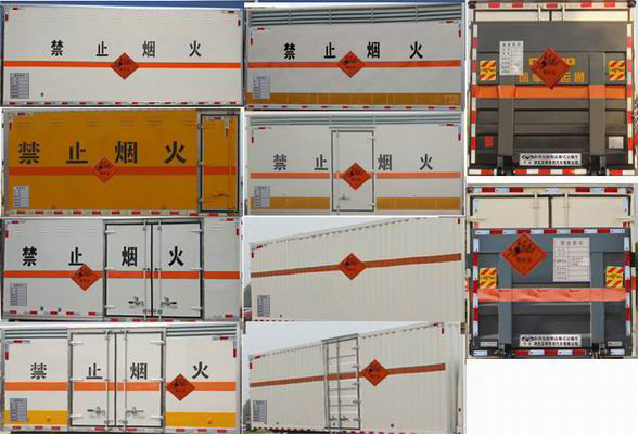 車廂頂部封閉,不可開啟;安裝限速裝置,限速80km/h,安全裝置為導靜電帶,用于防止靜電,該車安裝帶有衛星定位功能的行駛記錄儀,僅采用前盤制動器和安裝ABS的底盤,排氣管前置,僅采用子午線輪胎;該車為危險貨物運輸車.用于運輸具有獨立容器(瓶)包裝的:黑火藥,壓縮黑火藥,電引爆雷管,爆破炸藥,點燃導火索;類項號:1.1D,1.1D,1.1B,1.1D,1.4G;車輛類型為EX/Ⅱ型;側防護和后防護裝置材料材質為Q235碳鋼,側防護與箱體底部焊接連接,后防護裝置與車架采用焊接連接,后防護截面尺寸(mm):100×50,離地高度為500mm;,選裝側門型式及位置,選裝不開側門,廂體側面板選裝開百葉窗,選裝瓦楞板結構,選裝液壓升降尾板,選裝液壓升降尾板時收起狀態的水平長度為300mm;選裝不開側門時寬度2200mm;發動機型號與油耗值一一對應:4B2-95C50/10.83(L/100km),WP2.1Q95E50/12.39(L/100km),4B2-110C50/12.97(L/100km),WP2.3Q110E50/12.01(L/100km),CA4DC3-12E5-30/12.55(L/100km),ABS生產廠家/型號:上海萬捷汽車控制系統有限公司/VIE ABS-II. |
