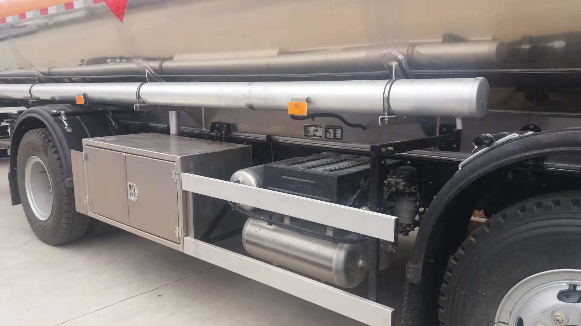 1、該車適用于危險品運輸,運送危險貨物車輛類型為:FL型,類項號:3。罐體有效容積25.2立方米,運輸介質:柴油、煤油、汽油,密度:830、800、700千克/立方米。罐體外形尺寸(長×寬×高)(mm):9000×2300×1500。2、側/后防護材料均為鋁合金,螺栓連接;后防護截面尺寸120×60mm,下邊緣離地高500mm。第二軸選裝膠制擋泥板或方形擋泥板,罐體上部選裝上走道,選裝后牌照燈。3、隨底盤選裝平頂駕駛室;選裝駕駛室前面罩;高頂駕駛室頂部氣喇叭為選裝件;駕駛室前角擾流板為選裝件。僅選用排氣管前置、限速裝置(限速80km/h)、前輪盤式制動及子午線輪胎的底盤;安裝帶衛星定位功能的行駛記錄儀。ABS型號/生產廠家:ABS 8/東科克諾爾商用車制動系統(十堰)有限公司。采用的發動機DDi75E350-60對應油耗值為38.1L/100km。 該車后軸為采用空氣懸架. |