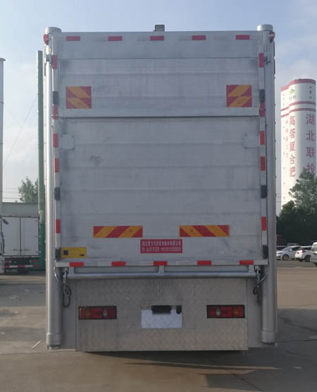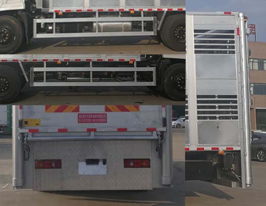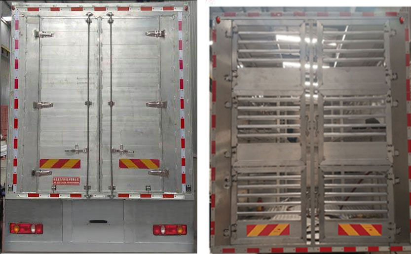 擴展箱體后門結構;隨底盤選裝駕駛室;選裝兩層、三層、四層倉柵結構;選裝箱體前部帶單開門和封板結構;選裝前部帶空調結構;選裝后部液壓圍板結構,后部裝有升降機和液壓尾板,液壓尾板收起狀態的水平長度為280mm,液壓尾板重量550kg;選裝后部不帶升降機和液壓尾板結構,即普通雙開門結構時,整備質量為8400kg;整車長/貨箱內長/軸距/后懸對應關系(mm):9000/6750/5000/2570,9000/6400/5000/2570,8600/6150/4700/2470;僅采用5000mm和4700mm軸距;整備質量/載質量對應關系(kg):8850/8955,8400/9405;貨箱底板到倉柵頂部的高度為2600mm,箱體兩側開窗,中間有隔欄,側防護材質:矩形鋁合金型材6061-T5,連接方式螺栓連接;后防護材料Q235B,焊接連接,與車輛結構為一體,后防護斷面尺寸:120×80mm,下邊緣離地高度430mm;ABS型號:3631010-C2000;生產廠家:東科克諾爾商用車制動系統(十堰)有限公司;安裝帶有衛星定位功能的行駛記錄儀;采用的發動機與油耗值(L/100Km)對應關系為: ISD270 50/29.0,ISD210 50/29.0,ISD180 50/29.0,EQH180-53/29.0,ISB180 50/29.0,ISB210 50/29.1;該車專用裝置主要由箱體組成,用于畜禽運輸. |