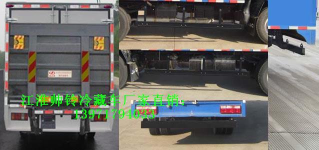 國五藍牌江淮帥鈴冷藏車標準配置:國內知名廠商生產的玻璃鋼、彩鋼廂板,各板塊間用高強度結構膠粘接,配以鋁合金型材鉚接成整體,中間8CM聚氨脂泡沫保溫,箱體內頂部安裝LED頂燈,安裝排水孔。廂頂封閉,制冷效果更顯著。門鉸鏈及栓桿等可選用不銹鋼和鍍鋅件兩種.