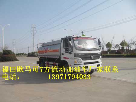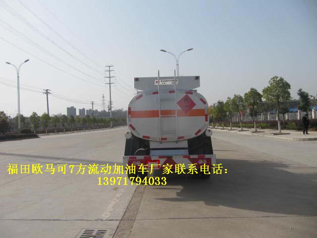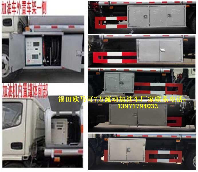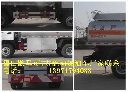 福田歐馬可7方國五流動加油車罐體有效容積:6立方米(公告容積),實際容積7方(嚴格按尺寸制作),介質:汽油,柴油,類項號:3,密度:700千克/立方米,罐體外形尺寸(長×寬×高)(mm):1,加油機內裝于罐體前部時:4200(含加油機倉800)×1960×1320,2,加油機外裝在車架一側時:4200x1760x1170;.隨底盤選裝駕駛室,排氣管前置,安裝具有衛星定位功能的行駛記錄儀,安裝前輪盤式制動器,僅采用底盤子午線輪胎以及限速裝置,限速80km/h。