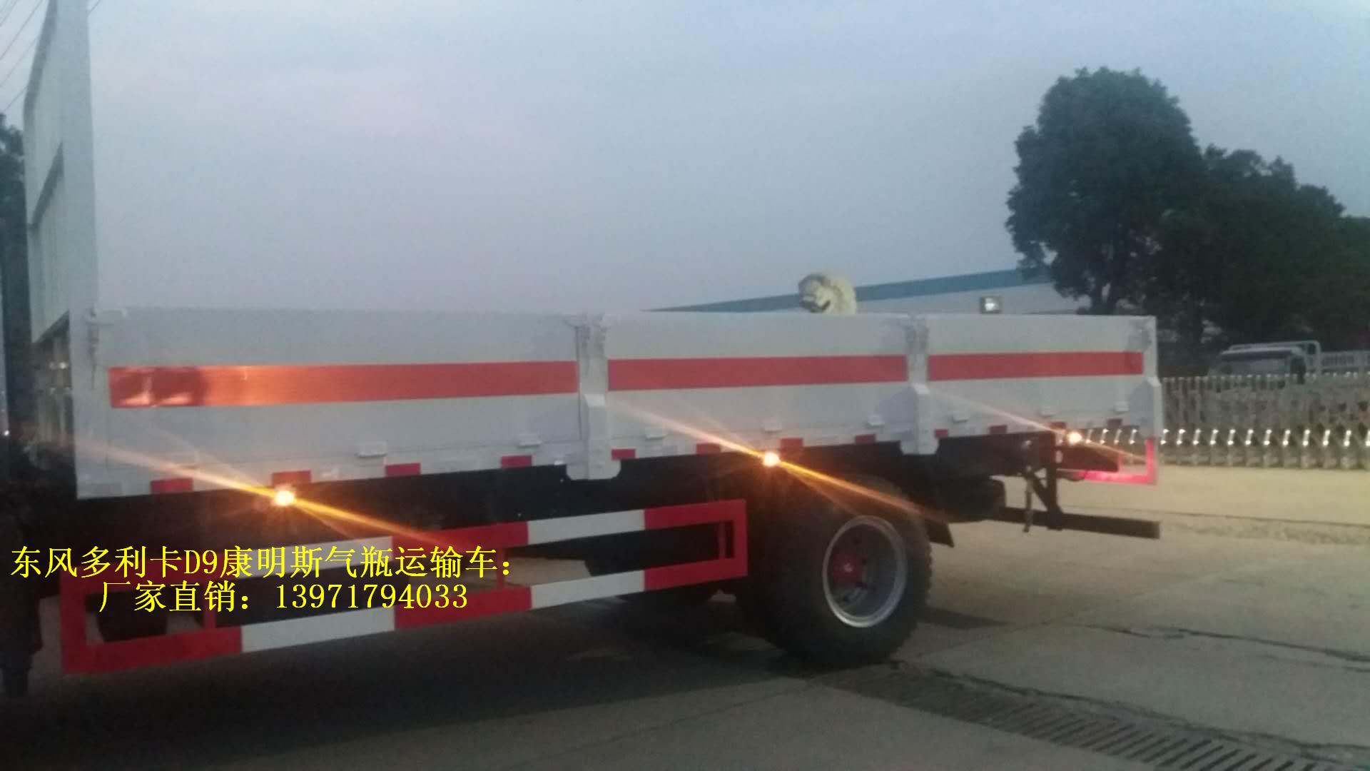 東風多利卡D9康明斯氣瓶運輸車為廂體選裝無柵欄.運輸具有獨立罐(瓶)容器包裝的易燃氣體:液化石油氣,壓縮天然氣,乙炔,乙烷,丁烷,丁烯,丙烯.甲烷.二甲醚,壓縮氫.類項號2.1,運輸具有獨立容器包裝的非易燃無毒氣體:二氧化碳,壓縮氧. 壓縮空氣(氮,氦,氬,氖),類項號2.2,該車運輸的氣瓶盛裝介質2.1項易燃氣體時,車輛左、右側及后部粘貼“易燃氣體”標示牌,該車運輸的氣瓶中盛裝介質2.2項非易燃無毒氣體時,車輛左、右側及后部粘貼“不燃氣體”標示牌.廂體顏色可變化.側面及后下部防護裝置材料為Q235,與車架采用焊接連接.后下部防護裝置斷面尺寸(mm):120×50,離地高度:490mm。選裝液壓升降尾板,選裝液壓尾板時收起狀態的水平長度為300mm,僅采用排氣管前置、子午胎,限速裝置,輔助制動裝置和前盤制動器的底盤;限速80km/h.。