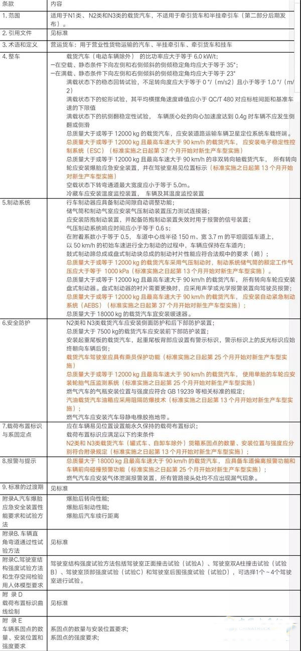 以下為《營運貨車安全技術(shù)條件第1部分:載貨汽車》,橙色部分為過渡條款。
