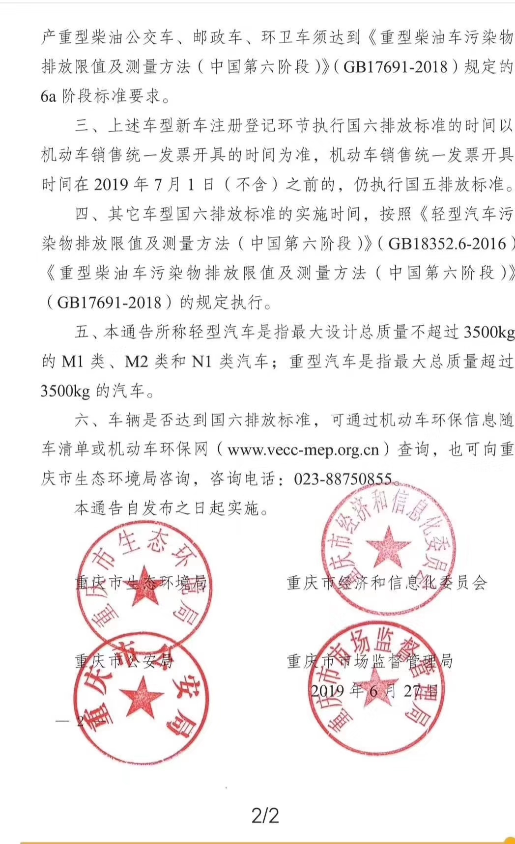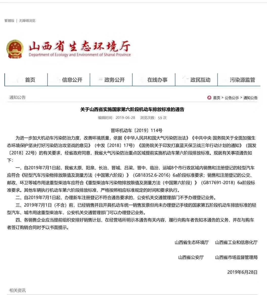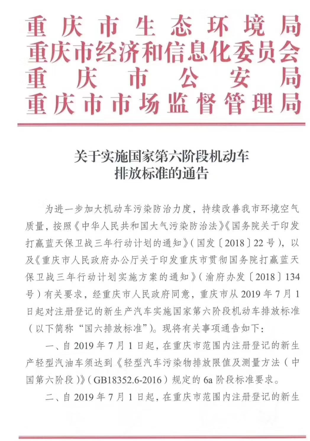 緊急通知!昨日,山西省,重慶市也下達(dá)正式文件,2019年7月1日起輕型車輛將開始執(zhí)行國(guó)六排放標(biāo)準(zhǔn)!