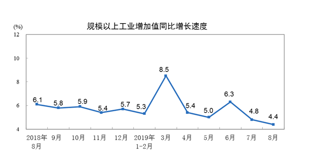 2019年8月份,規模以上工業增加值同比實際增長4.4%(以下增加值增速均為扣除價格因素的實際增長率),比7月份回落0.4個百分點。從環比看,8月份,規模以上工業增加值比上月增長0.32%。1—8月份,規模以上工業增加值同比增長5.6%。