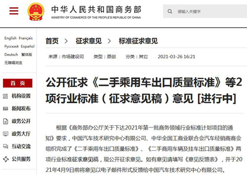 《商務(wù)部辦公廳關(guān)于下達(dá)2021年第一批商務(wù)領(lǐng)域行業(yè)標(biāo)準(zhǔn)計(jì)劃項(xiàng)目的通知》要求,中國汽車技術(shù)研究中心有限公司、中華全國工商業(yè)聯(lián)合會(huì)汽車經(jīng)銷商商會(huì)組織完成了《二手乘用車出口質(zhì)量標(biāo)準(zhǔn)》、《二手商用車輛及掛車出口質(zhì)量標(biāo)準(zhǔn)》兩項(xiàng)行業(yè)標(biāo)準(zhǔn)征求意見稿,現(xiàn)公開征求意見。如有意見請(qǐng)?zhí)顚憽兑庖姺答伇怼罚⒂?021年4月9日前將意見以電子郵件形式反饋給中國汽車技術(shù)研究中心有限公司。