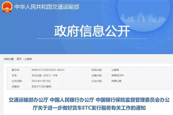 截至2021年9月底,全網(wǎng)ETC平均使用率已超過(guò)66%,高速公路網(wǎng)通行效率大幅提升。特別是2021年以來(lái),貨車ETC使用率持續(xù)提升,但部分地區(qū)仍存在貨車ETC難辦理等問(wèn)題。為切實(shí)解決該問(wèn)題,保護(hù)貨車司機(jī)合法權(quán)益,促進(jìn)物流降本增效,交通運(yùn)輸部聯(lián)合中國(guó)人民銀行、中國(guó)銀行保險(xiǎn)監(jiān)督管理委員會(huì)發(fā)布通知,要求各地進(jìn)一步做好貨車ETC發(fā)行服務(wù)。